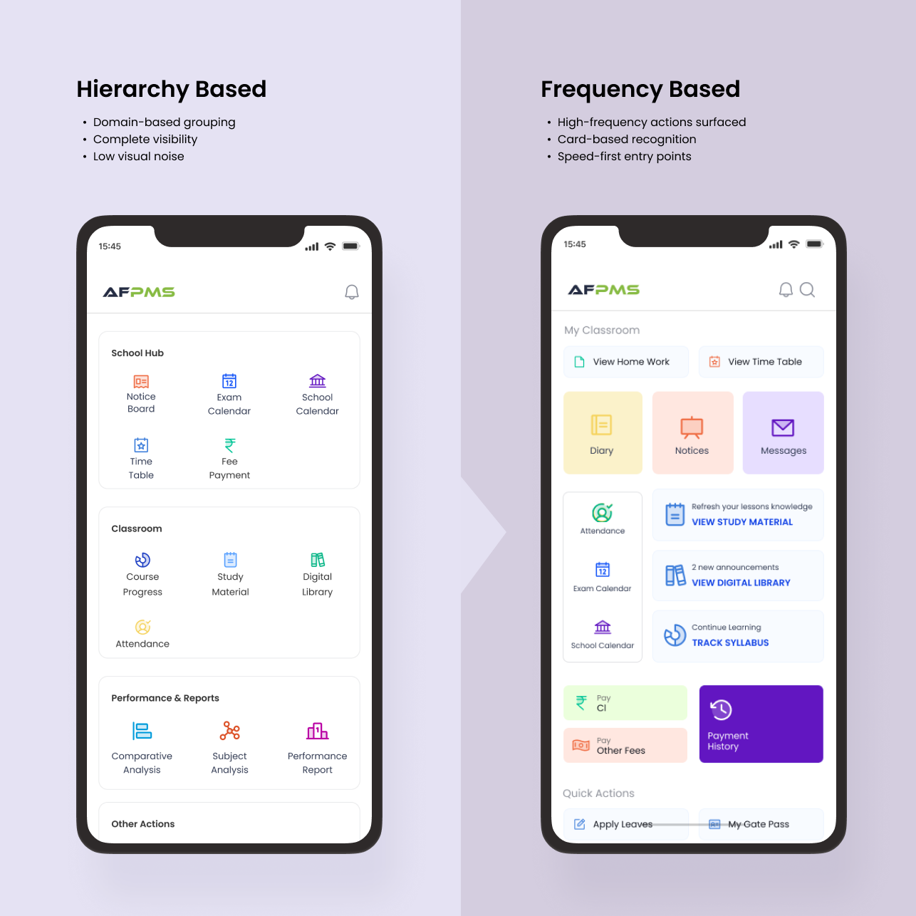 School systems are complex, fragmented, and deeply human. Teachers are overloaded with admin. Parents want transparency but lack time. Students need structure without pressure. School leaders need visibility without micromanagement. Most school apps either: solve only communication, or digitize admin without improving experience. AFPMS started as a coaching-focused LMS, but mid-way, the founders decided to pivot it into a full-fledged school management system. I joined as the sole designer at this inflection point — when the product direction, user base, and expectations were all changing at once.